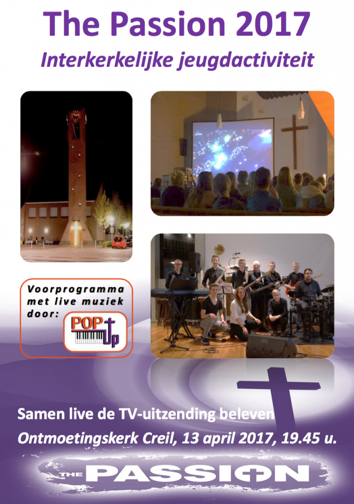 Velen van ons zijn inmiddels gewend de televisieuitzending van De Passion op televisie te volgen op Witte Donderdag. Dit jaar wordt dit muzikale evenement gehouden in Leeuwarden. Speciaal voor tieners wordt de uitzending geprojecteerd op een groot scherm in de Ontmoetingskerk in Creil. Dat wordt dit jaar voor de 5e keer gedaan. Buiten staat een groot verlicht kruis tegen de kerktoren. Vlak voordat de uitzending begint wordt dit kruis naar binnen gedragen. Er is een inloop met koffie, thee en fris vanaf 19.45u. Tijdens het voorprogramma speelt de band PopUp (die bij ons in Nagele was op 5 maart jl.) verschillende nummers uit eerdere edities. De televisie uitzending eindigt om ongeveer 22.oou. Na afloop is iedereen welkom op de ‘after Passion’ om nog even gezellig wat te drinken en na te praten.